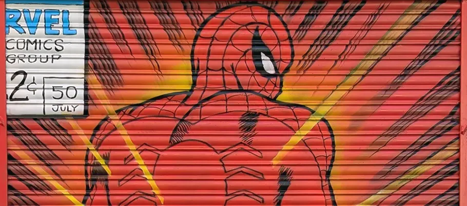 En este proyecto hemos transformado un cierre metálico en el barrio de Lavapiés, Madrid, en un homenaje a los cómics clásicos de Marvel. Se trata de un graffiti de superhéroes inspirado en la mítica portada número 50 de The Amazing Spider-Man, ilustrada por John Romita en los años 60. Este mural urbano reproduce con detalle la escena en la que Spiderman aparece en conflicto con su propia identidad, una de las imágenes más icónicas del personaje.