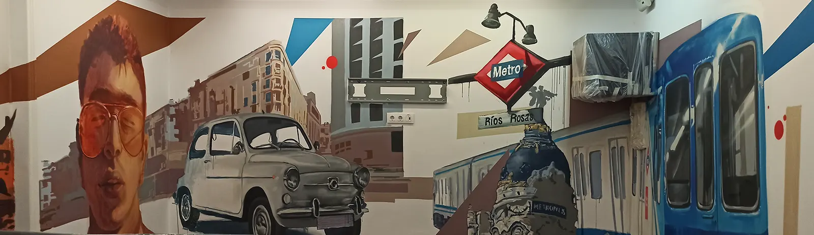 Este mural fue concebido como una pieza nostálgica y urbana para un espacio creativo de carácter contemporáneo, fusionando dos elementos icónicos de la cultura española: el Seat 600 y la figura juvenil con estética retro. Es un homenaje a una generación que se mueve entre el recuerdo de lo clásico y la actitud del presente.
