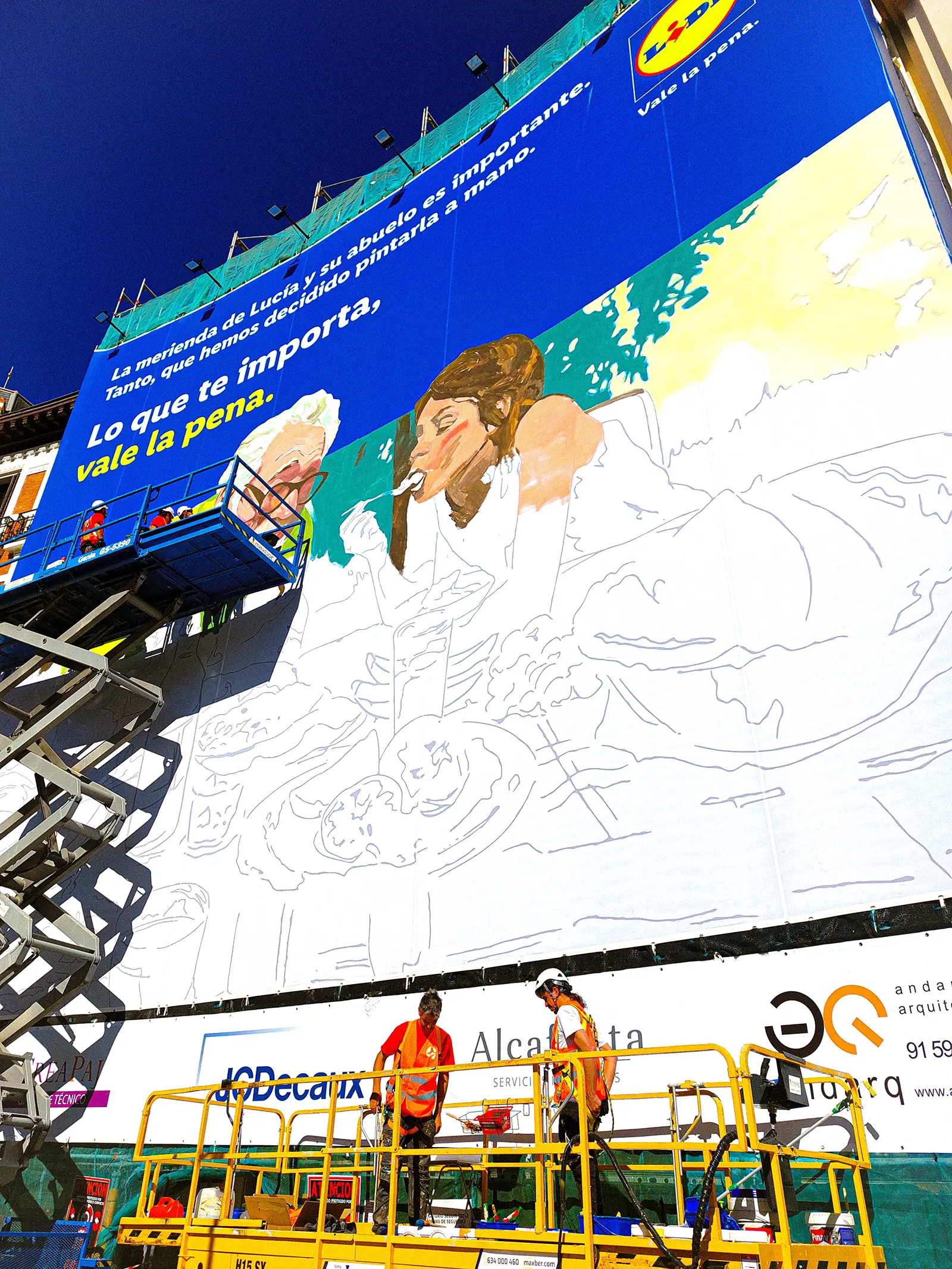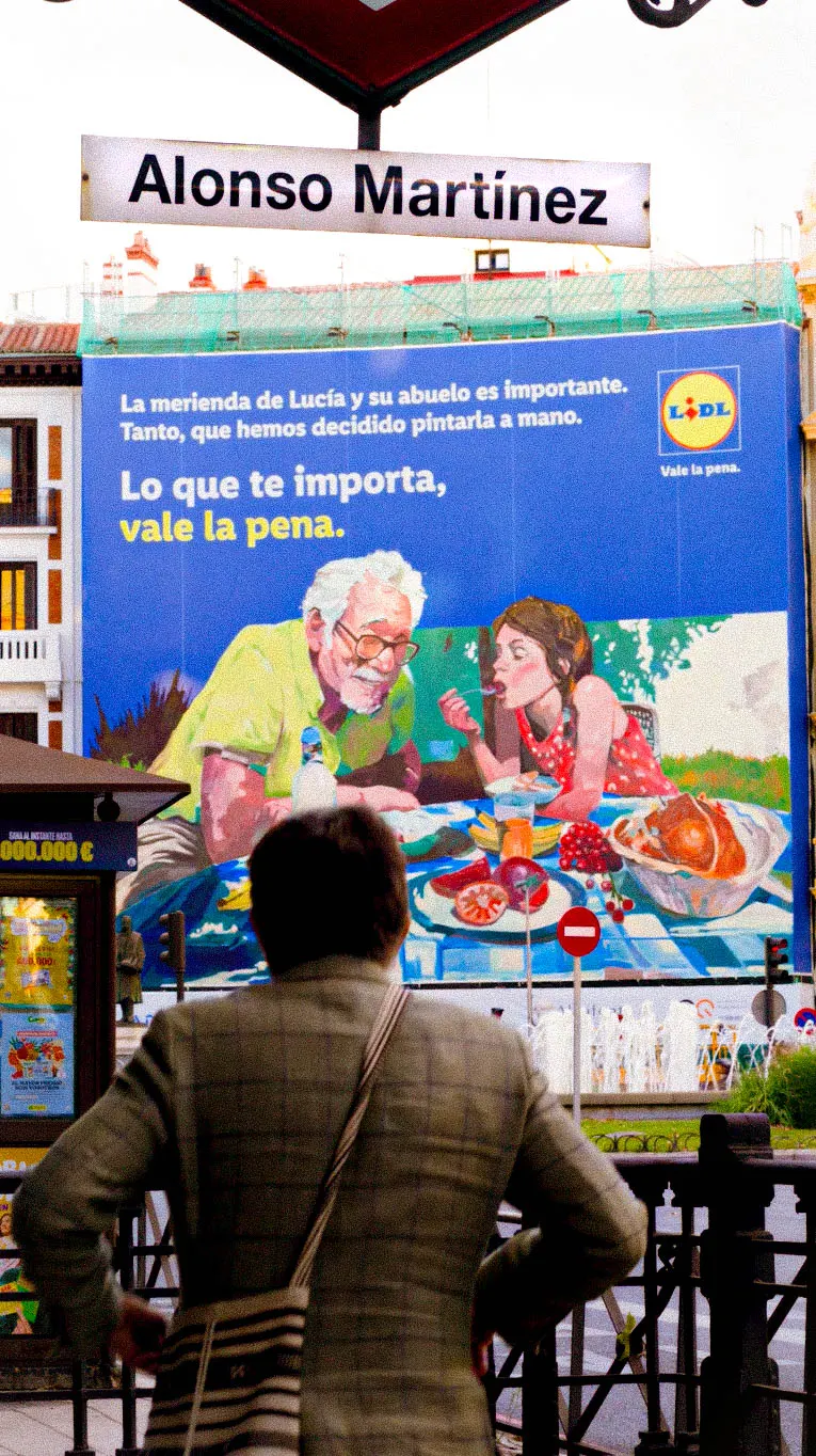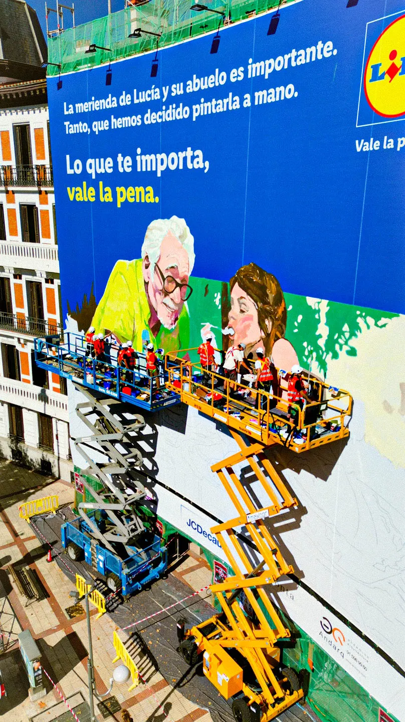 En este proyecto colaboramos con Lidl España para transformar su nueva campaña en una lona publicitaria en Madrid instalada en pleno centro, en la plaza de Alonso Martínez. El diseño original, creado por el artista Iñigo Sesma, fue producido íntegramente por nuestro equipo de Estudio Graffiti, aportando nuestra experiencia en publicidad urbana, intervenciones a gran formato y producción mural profesional para marcas.
